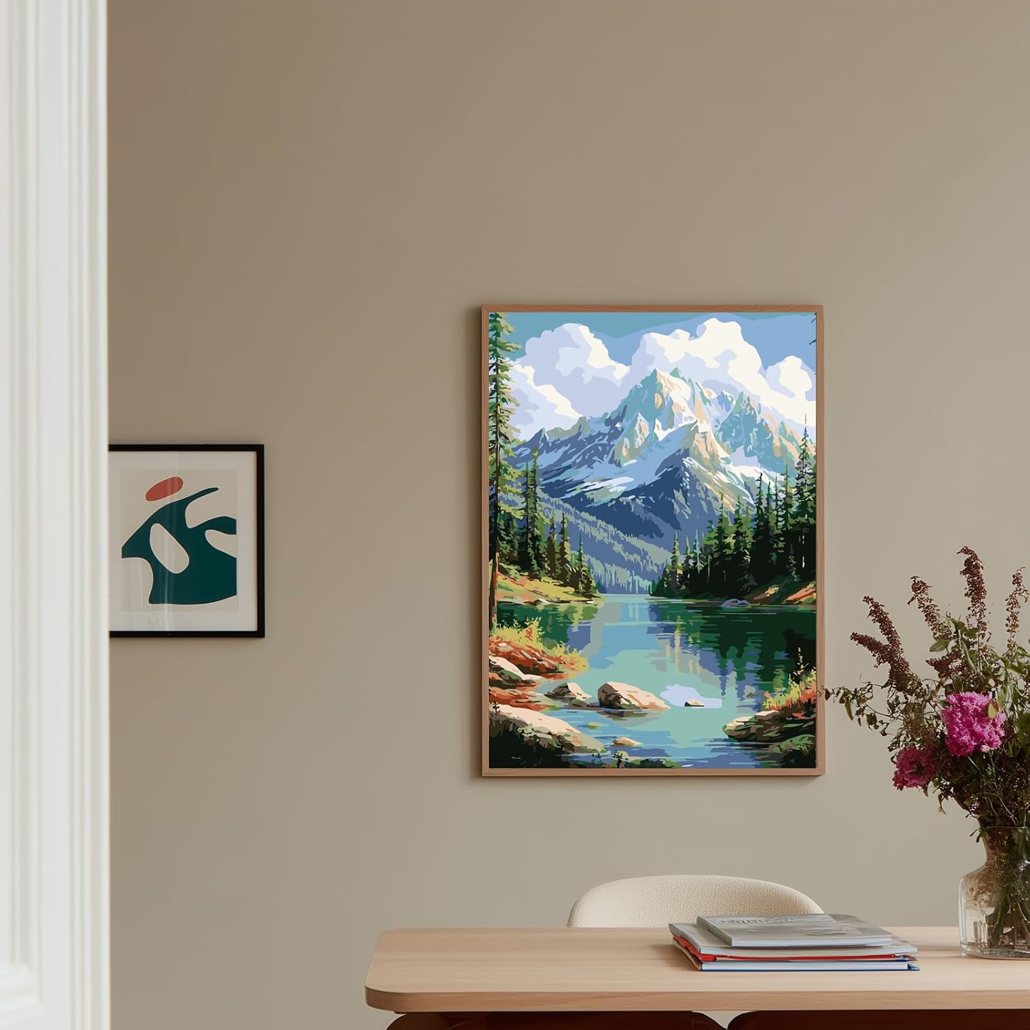 [Stunning Natural Scenery, Immersive Experience]This paint by numbers vividly depicts a magnificent scene of snowy mountains and a tranquil lake. Towering snow – capped peaks, a serene lake, and dense pine forests set each other off, with the blue sky and white clouds reflected in the water, just like a fairyland. Hanging it at home is like bringing this fresh and natural beauty indoors, offering an immersive visual treat that soothes your body and mind.